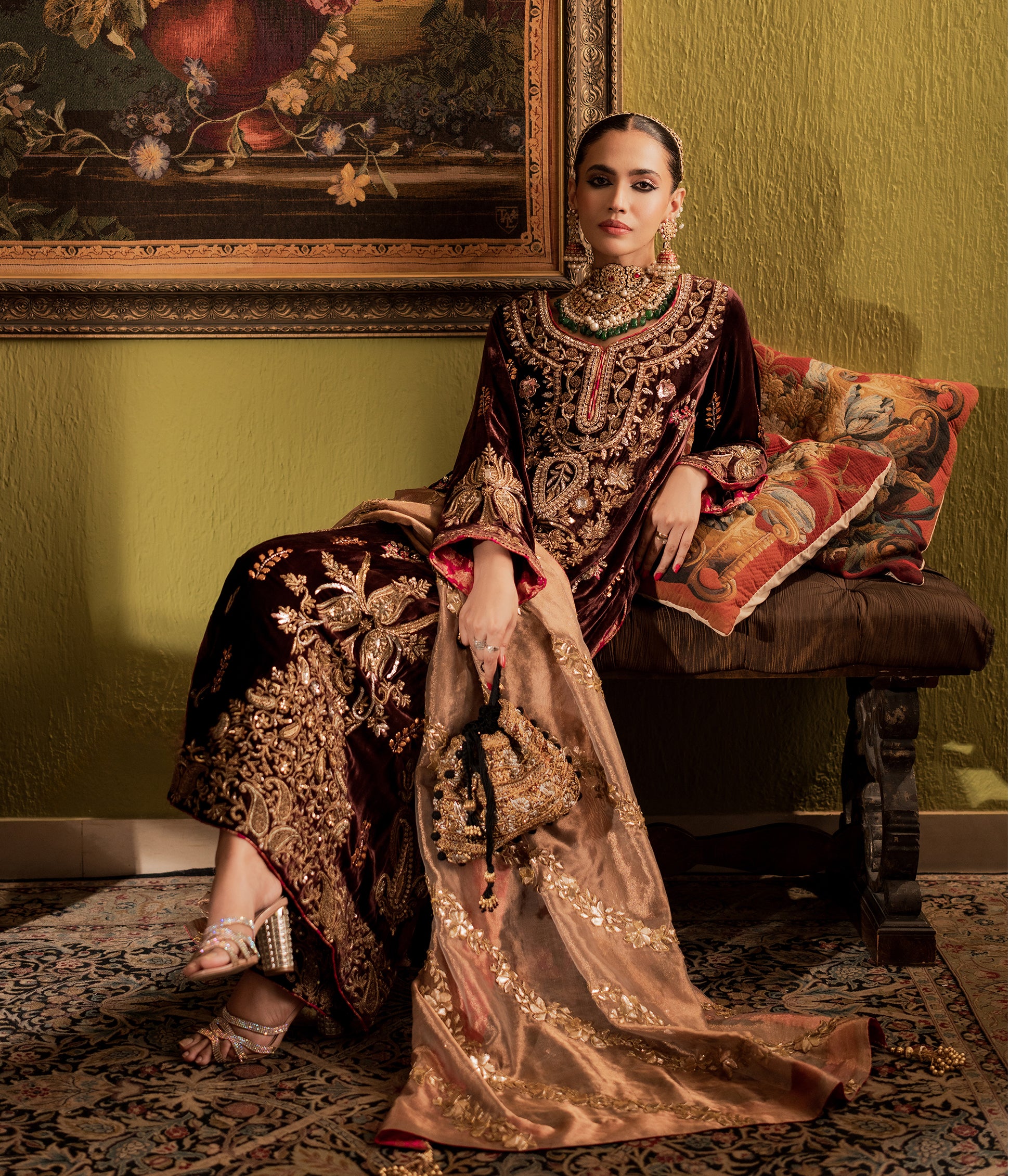 Farrukh — a name that whispers of heritage, grace, and the art of enduring beauty.In this timeless collection by Miri by Sabbiha Mansoor, each piece is a poetic reflection of legacy — handcrafted in silk velvet, tissue, and chamois silk, adorned with the finesse of Zardozi, Dabka, Vasli, Kamdani, and Tilla work.