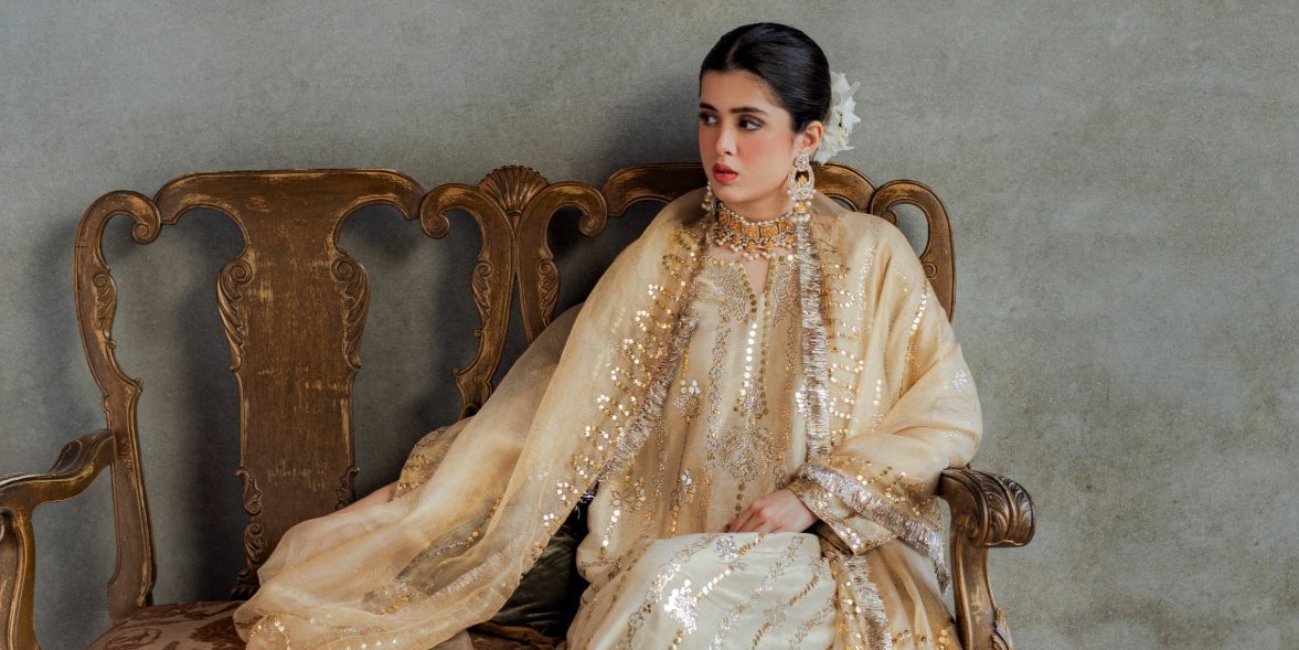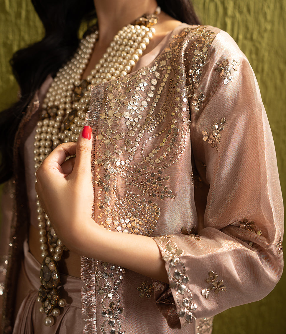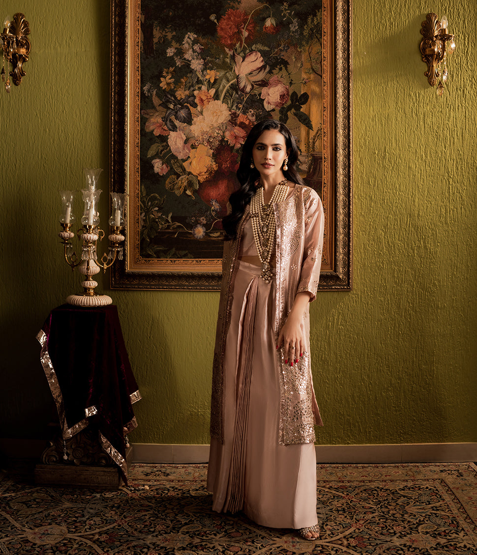 Aydora: Gift of the Moon — where radiance meets refinement. The signature Kamdani work shimmers softly across a tissue coat, capturing the gentle glow of moonlight.