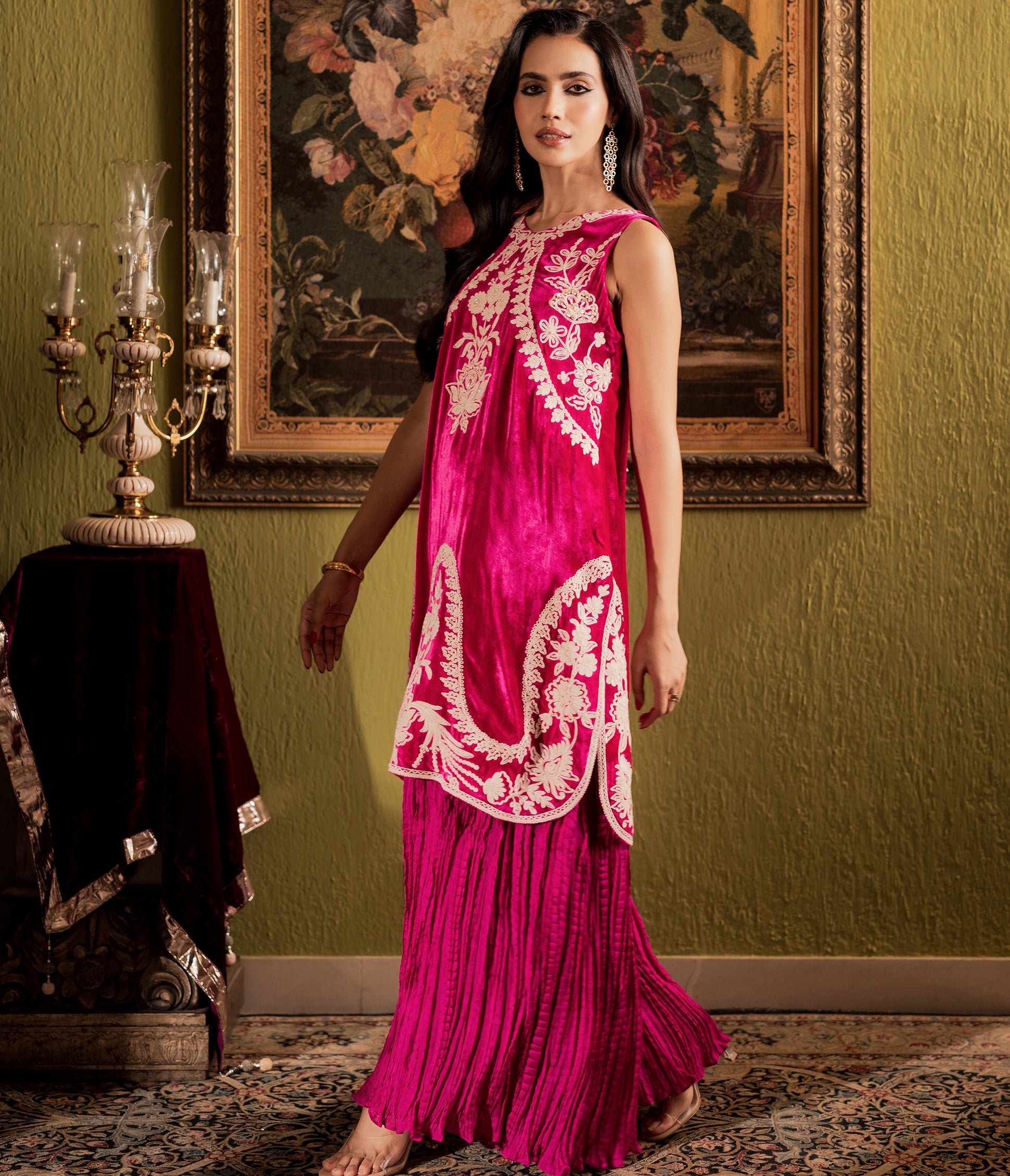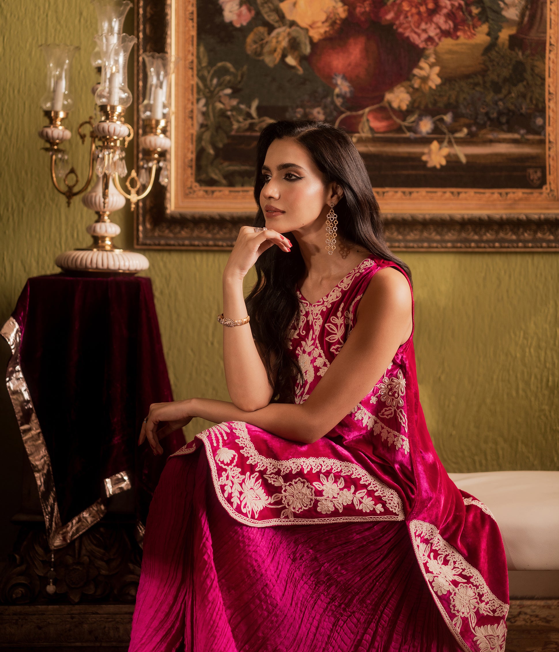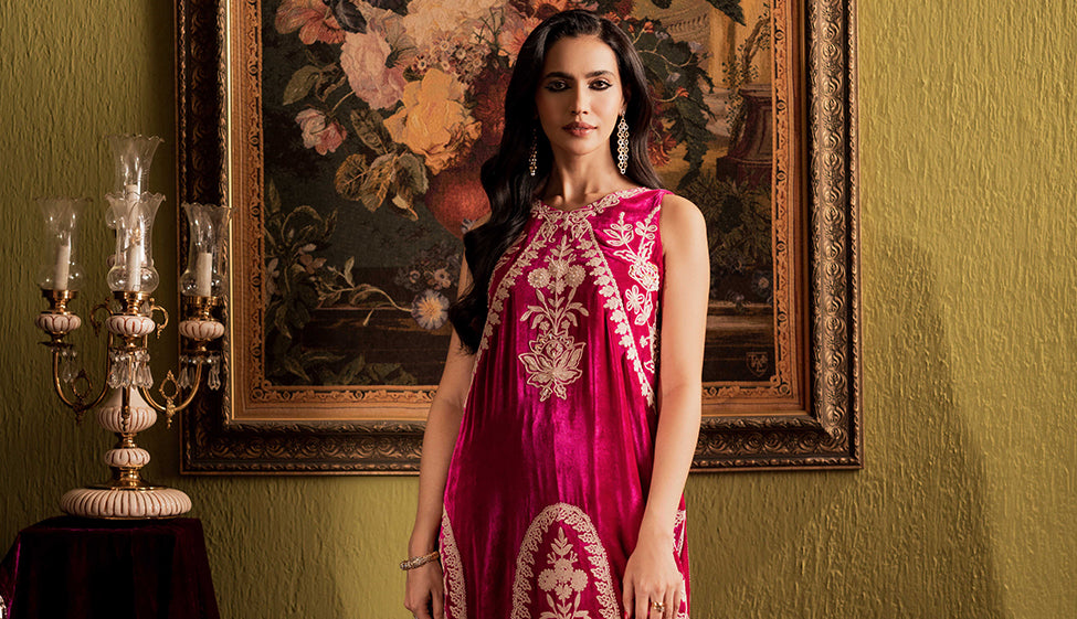 Fulya: Spring Flower — a symphony of softness and grace. The silk velvet shirt, adorned with intricate Dori embroidery and delicate pearls, evokes the quiet charm of a spring blossom.