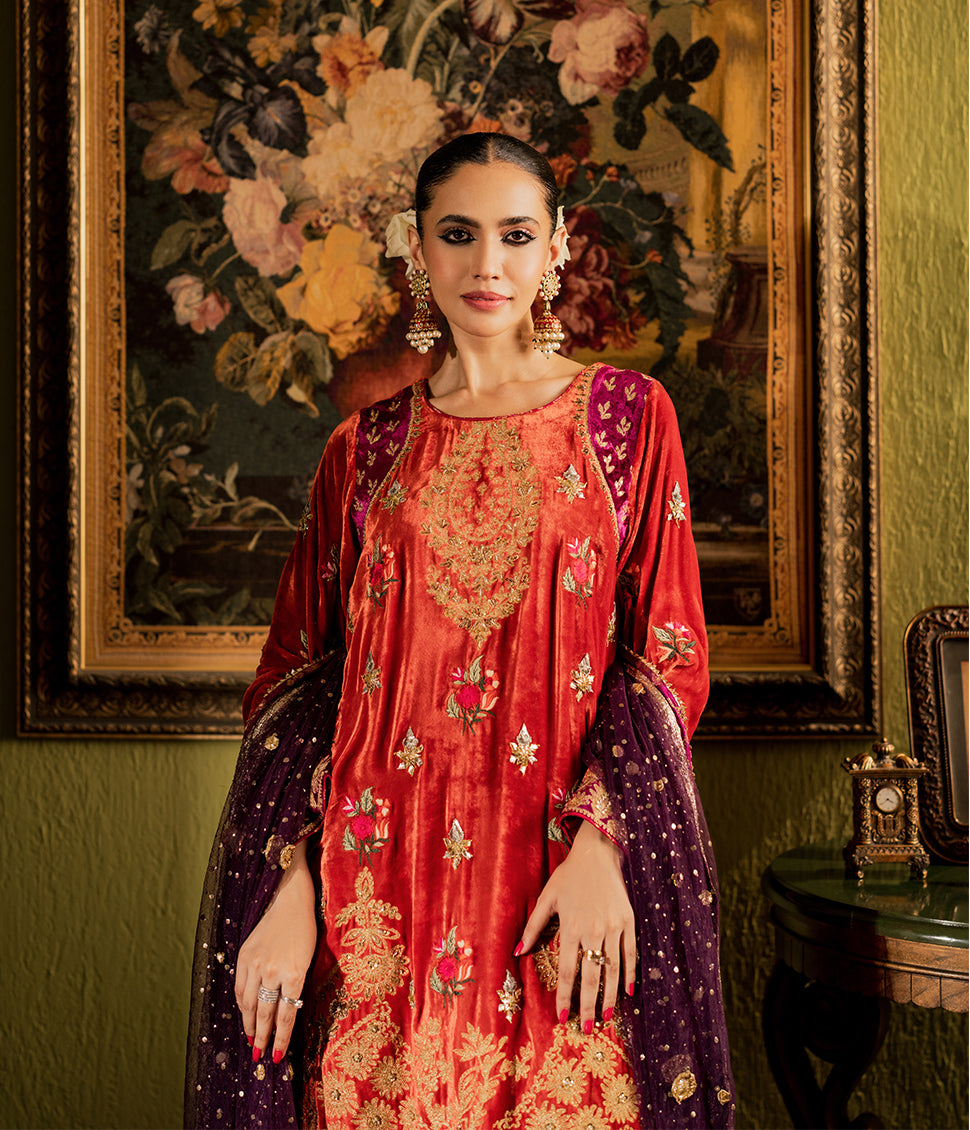 Orange velvet shirt adorned with velvet appliqué, radiating warmth and regal charm.
