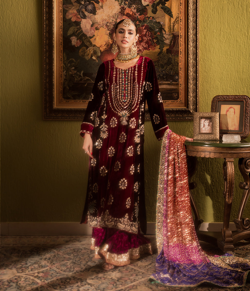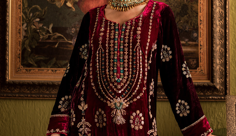 Lalezar: Garden of Tulips — a poetic celebration of grace and grandeur. Handcrafted on sumptuous silk velvet, this set blossoms with intricate Dabka, Vasli, and Resham work, each stitch echoing the charm of timeless craftsmanship.