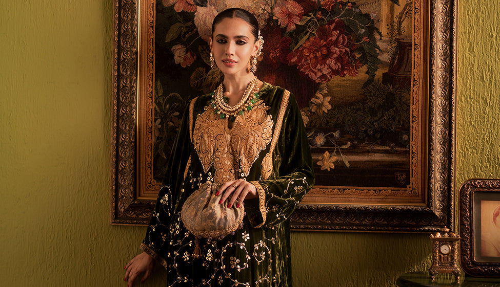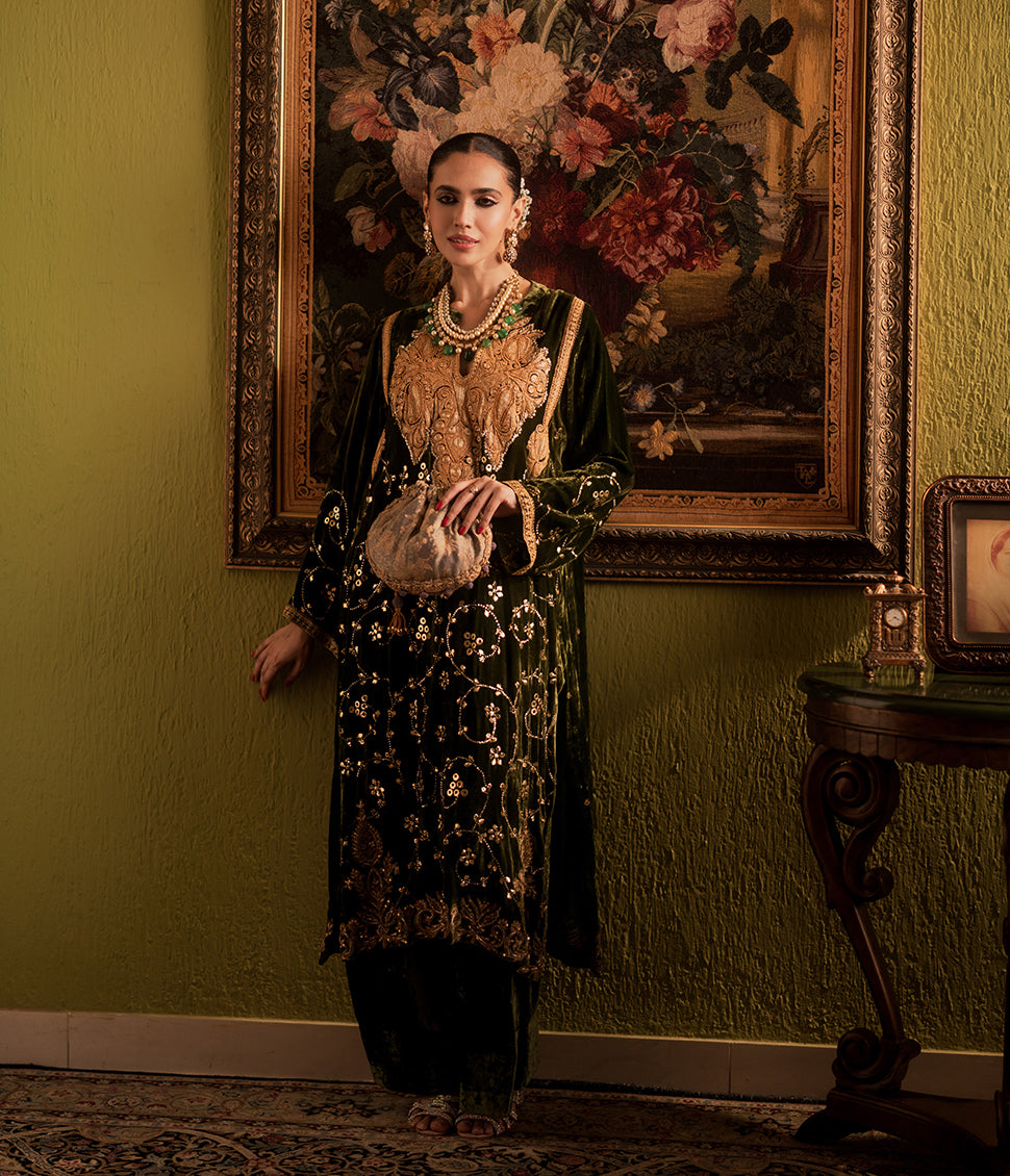 Velvet shirt and shalwar in a deep olive hue, exuding timeless sophistication.
