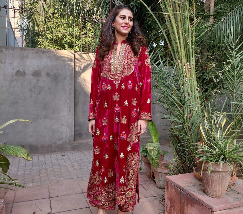 This dress includes a shirt and pants made from Miri Velvet. It features intricate marori, tilla, dabka, and resham embroidery, giving it a luxurious and traditional appearance. The deep red velvet base combined with the gold and resham threadwork creates an elegant and regal look, making it suitable for festive or formal occasions. The detailed craftsmanship and use of vibrant colors enhance its appeal as a standout outfit.